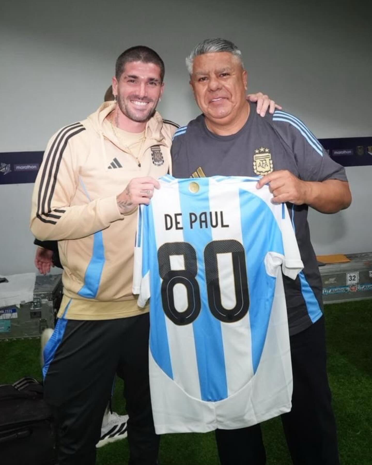 在完成阿根廷国家队第80次出场后,德保罗获赠纪念球衣。